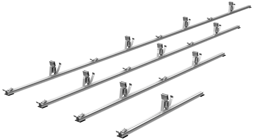 Die Reihenabstände zwischen den vormontierten Aufständerungen richtet sich nach der Modullänge. Damit die Montage einfach läuft, liefern wir mit der Montagehilfe eine „Schablone“, um die Reihen auf das richtige Maß zu bringen.